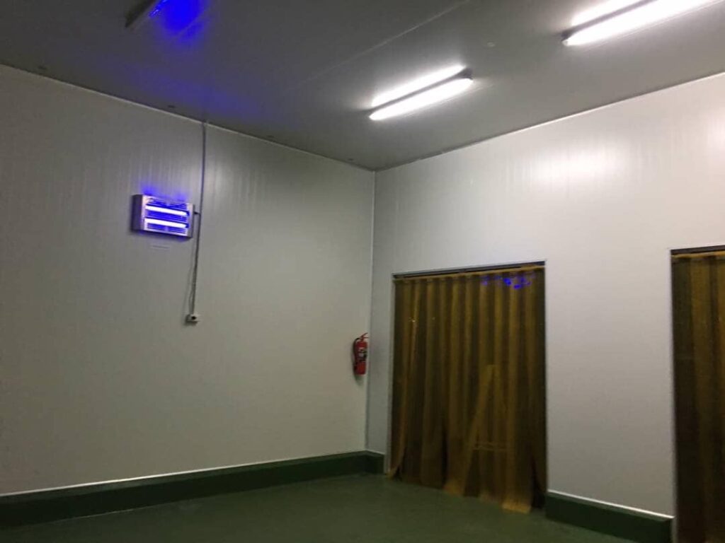 9. ห้องแอนตี้รูม ห้องนี้จะเป็นห้องพักสินค้าก่อนส่งหรือรับเข้ามาก่อนเข้าห้องเย็นก็ได้ มีประโยชน์สำหรับดักอากาศภายนอกไม่ให้เข้าสู่ตัวอาคารผลิตอาหาร ควรติดม่านพลาสติกกันแมลงหรือติดม่านอากาศเพิ่มด้วยจะยิ่งดี